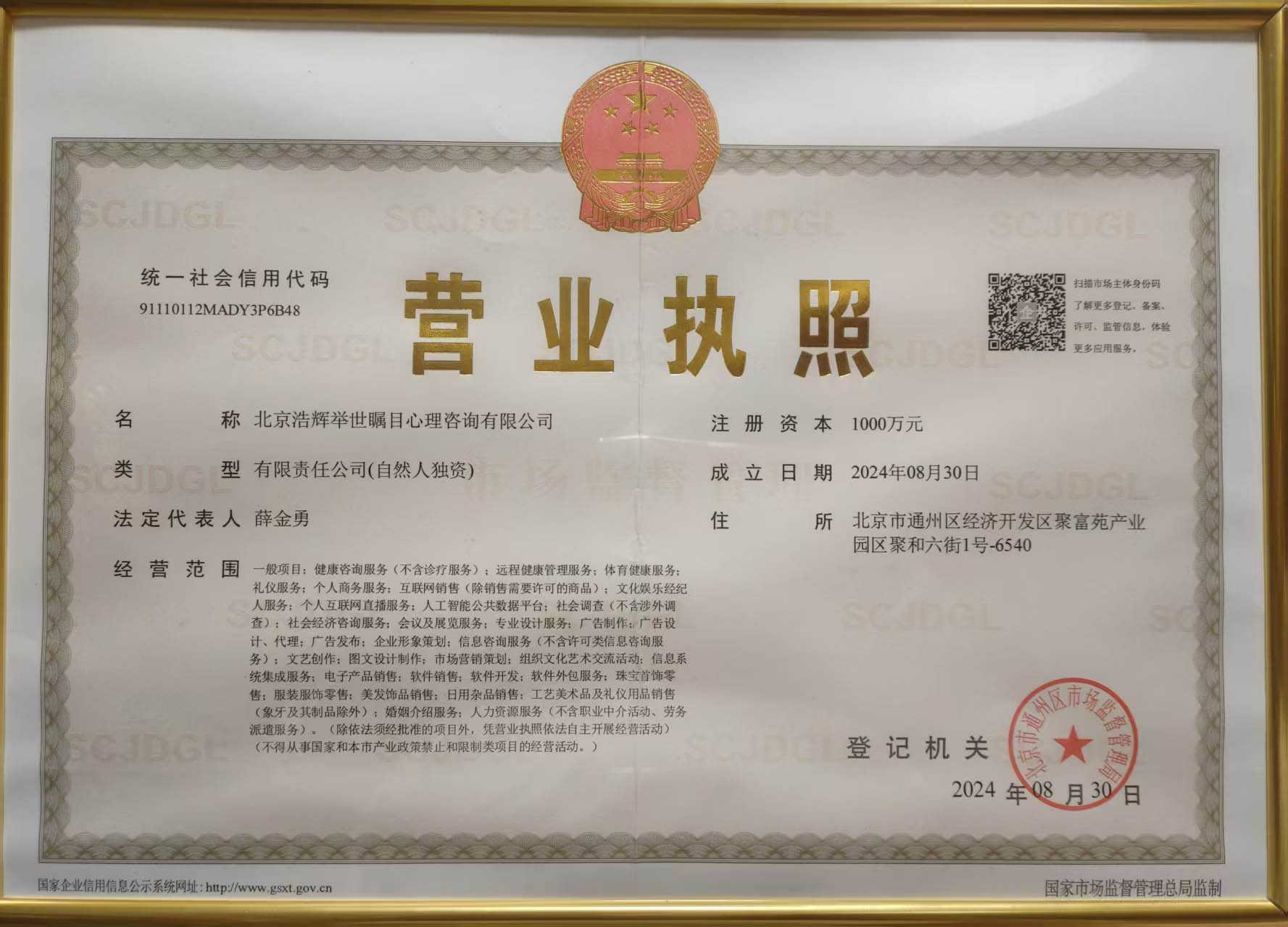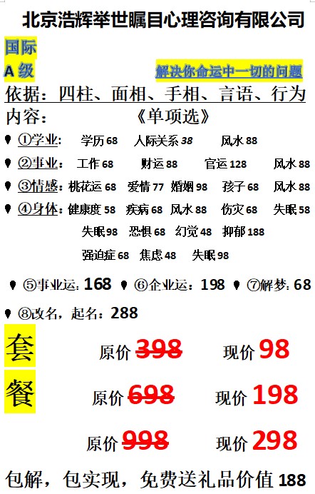 我是北京浩辉举世瞩目心理咨询有限公司的创始人薛金勇——本人从事教育行业→学习心理学→2000年自办幼儿园【学生考研,考博的很多】→2010年担任小学全校体育,音乐,美术【学生的学习成绩都很棒。】2012年获得【国际A级】咨询证书【学习心理学,玄学,哲学,神学】→至今成为【国际A级】心理咨询公司的创始人→每天接触很多博士四,博士三,研究生,不同国家,不同身份、地位的顾客咨询。咨询后大有效果,都是非常幸福的。